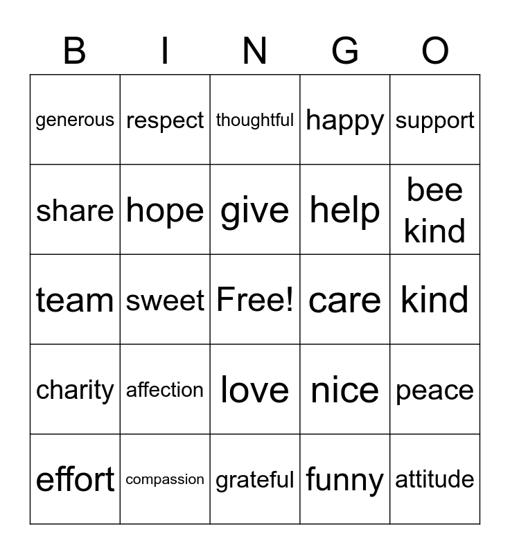 This bingo card has a free space and 26 words: love, funny, give, compassion, support, generous, share, respect, kind, nice, help, team, peace, effort, sweet, friendly, happy, charity, thoughtful, attitude, bee kind, grateful, care, affection, hope and pink.