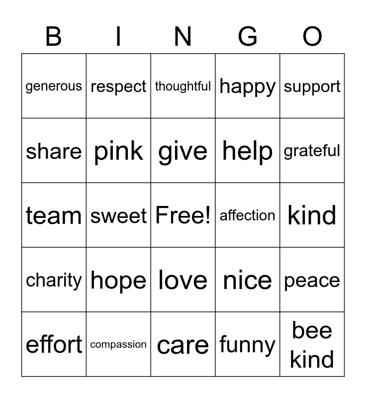 This bingo card has a free space and 26 words: love, funny, give, compassion, support, generous, share, respect, kind, nice, help, team, peace, effort, sweet, friendly, happy, charity, thoughtful, bee kind, grateful, care, affection, hope, pink and attitude.