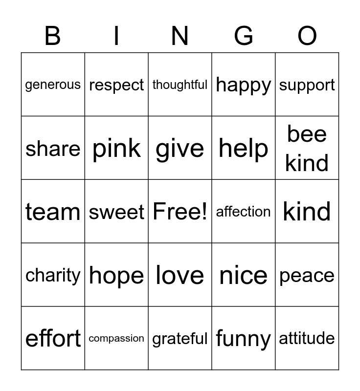 This bingo card has a free space and 26 words: love, funny, give, compassion, support, generous, share, respect, kind, nice, help, team, peace, effort, sweet, friendly, happy, charity, thoughtful, attitude, bee kind, grateful, affection, hope, pink and care.