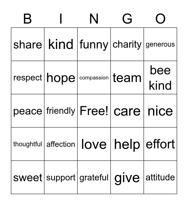 This bingo card has a free space and 26 words: love, give, compassion, support, generous, share, respect, kind, nice, help, team, peace, effort, sweet, friendly, happy, charity, thoughtful, funny, attitude, bee kind, grateful, care, affection, hope and pink.