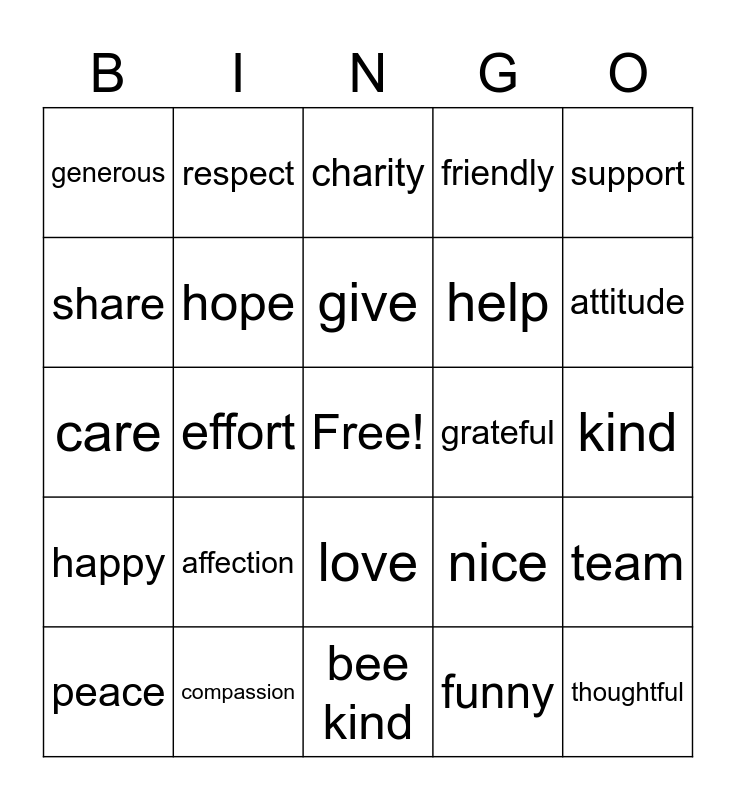 This bingo card has a free space and 26 words: love, funny, give, compassion, support, generous, share, respect, kind, nice, help, care, team, peace, effort, sweet, friendly, happy, charity, thoughtful, attitude, bee kind, grateful, affection, hope and pink.