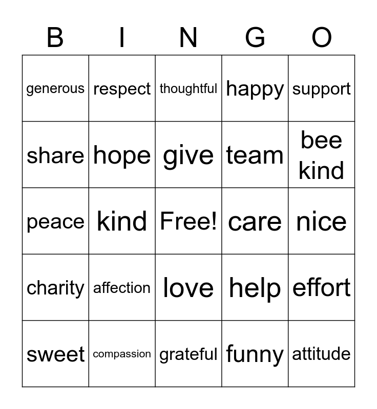 This bingo card has a free space and 26 words: love, funny, give, compassion, support, generous, share, respect, nice, help, team, peace, effort, sweet, kind, friendly, happy, charity, thoughtful, attitude, bee kind, grateful, care, affection, hope and pink.
