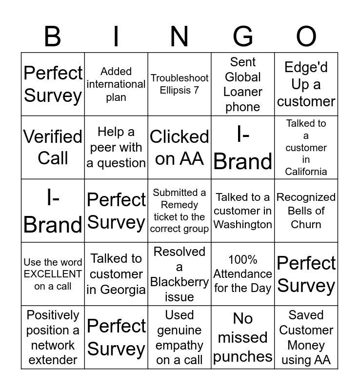 This bingo card has 25 words: Talked to customer in Georgia, Used genuine empathy on a call, Clicked on AA, Positively position a network extender, Edge'd Up a customer, Perfect Survey, Verified Call, Added international plan, Talked to a customer in Washington, Resolved a Blackberry issue, I-Brand, I-Brand, 100% Attendance for the Day, Perfect Survey, Help a peer with a question, Saved Customer Money using AA, Recognized Bells of Churn, Troubleshoot Ellipsis 7, Talked to a customer in California, Perfect Survey, Submitted a Remedy ticket to the correct group, Perfect Survey, Use the word EXCELLENT on a call, Sent Global Loaner phone and No missed punches.