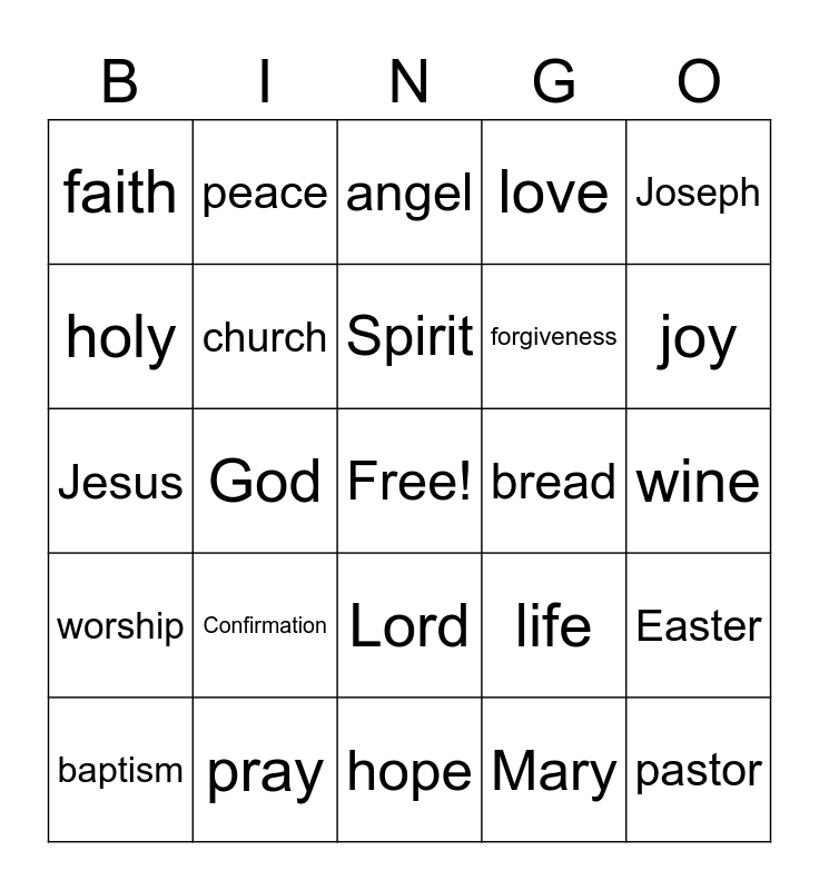 This bingo card has a free space and 34 words: grace, cross, service, Lent, wine, holy, church, hope, forgiveness, pastor, Jesus, peace, Mary, manger, worship, God, Lord, bread, Easter, baptism, pray, family, love, joy, Bible, Confirmation, angel, communion, Joseph, faith, heaven, Spirit, life and disciples.