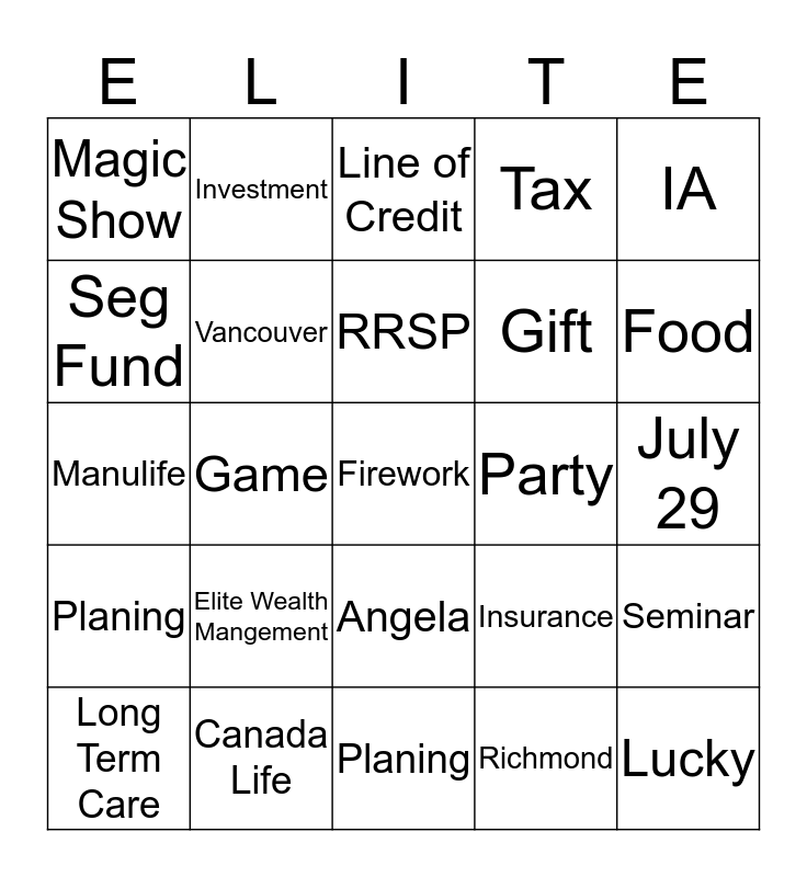 This bingo card has a free space and 24 words: Elite Wealth Mangement, Canada Life, RRSP, Long Term Care, IA, Magic Show, Seg Fund, Investment, Party, Angela, Gift, Manulife, Insurance, Seminar, Vancouver, Richmond, July 29, Line of Credit, Food, Game, Lucky, Planing, Tax and Planing.