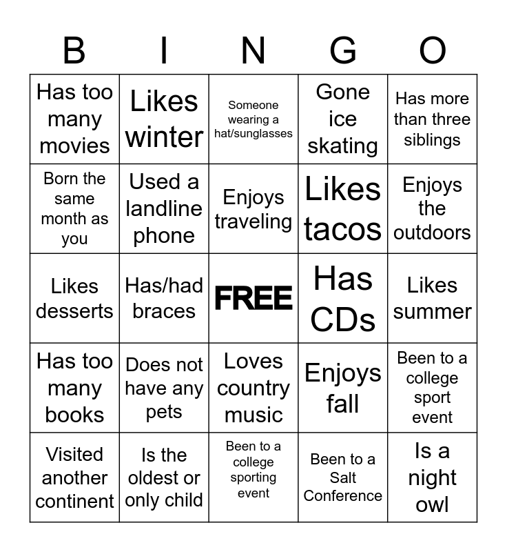 This bingo card has a free space and 77 words: Used dial up internet, 3 or more siblings, Born the same month as you, Been to the beach, Enjoys cats, Who’s lived in 2 or more states, Enjoys video games, Enjoys reading, Went to Salt Conference, Enjoys movies, Has been to a play, Enjoys math, Someone wearing a hat/sunglasses, Gone ice skating, Has played a sport, Likes desserts, Is the oldest or only child, Been to a college sporting event, Enjoys sports, Enjoys the outdoors, Likes fall, Likes tacos, Likes summer, Has too many movies, Likes winter, Likes spring, Has too many books, Likes naps, Played with Lincoln Logs, Has cd’s, Remembers floppy disks, Still uses Pandora, Gone roller skating, Has been to another country, Used a landline phone, Enjoys traveling, Enjoys coffee, Enjoys being outside, Has too many books, Does not have any pets, Has pet(s), Enjoys coffee, Wears glasses/contacts, Enjoys going to the movies, Used floppy disks, Can play a musical instrument, Enjoys fall, Has more than three siblings, Been to a national park/monument/site, Loves to read, Can whistle, Has CDs, Has been to a play, Gone Roller Skating, Has never broken a bone, Does not like coffee, Has a summer birthday, Gone ice skating, Has played a sport, Not in your connection group, Loves country music, Loves classical music, Enjoys the beach, Likes spicy food, Has been to Disney or Universal, Enjoys traveling, Lived in 2 or more states, Been to a college sport event, Enjoys winter, Likes superhero movies, Is an early riser, Is a night owl, Visited another continent, Has/had braces, Has been/is in Salt Company, Been to a Salt Conference and Enjoys the outdoors.