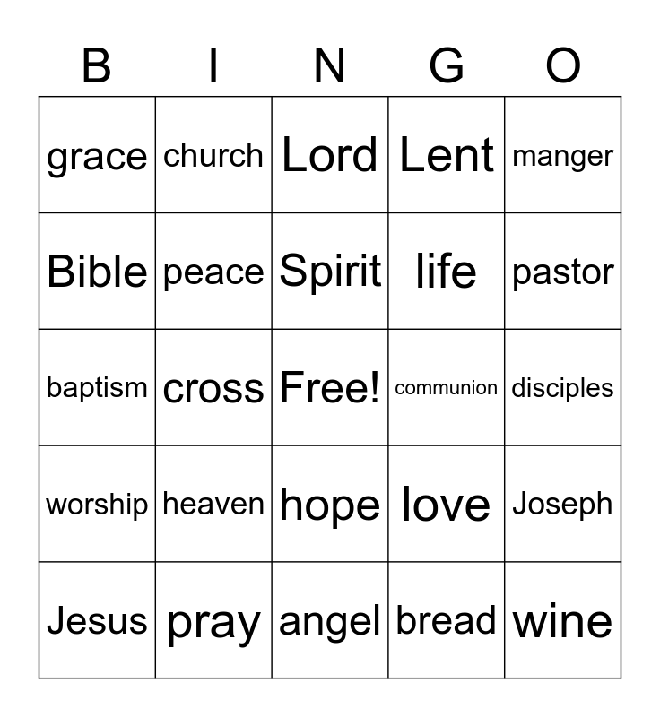 This bingo card has a free space and 34 words: faith, God, family, Mary, disciples, Bible, peace, angel, life, wine, baptism, church, bread, joy, worship, cross, hope, communion, Joseph, Jesus, pray, service, Lent, pastor, holy, heaven, Lord, forgiveness, manger, grace, confirmation, Spirit, love and Easter.
