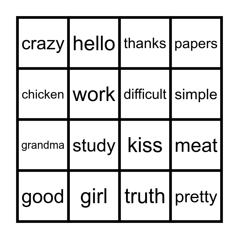 This bingo card has 16 words: girl, meat, thanks, crazy, grandma, hello, kiss, truth, chicken, work, good, papers, study, simple, difficult and pretty.