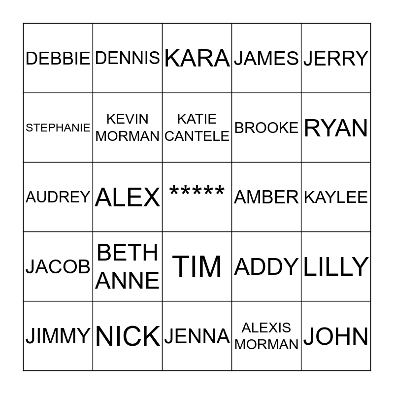 This bingo card has a free space and 24 words: BETH ANNE, NICK, KATIE CANTELE, JIMMY, JERRY, DEBBIE, STEPHANIE, DENNIS, AMBER, TIM, BROOKE, AUDREY, ADDY, LILLY, KEVIN MORMAN, ALEXIS MORMAN, KAYLEE, KARA, RYAN, ALEX, JOHN, JACOB, JAMES and JENNA.