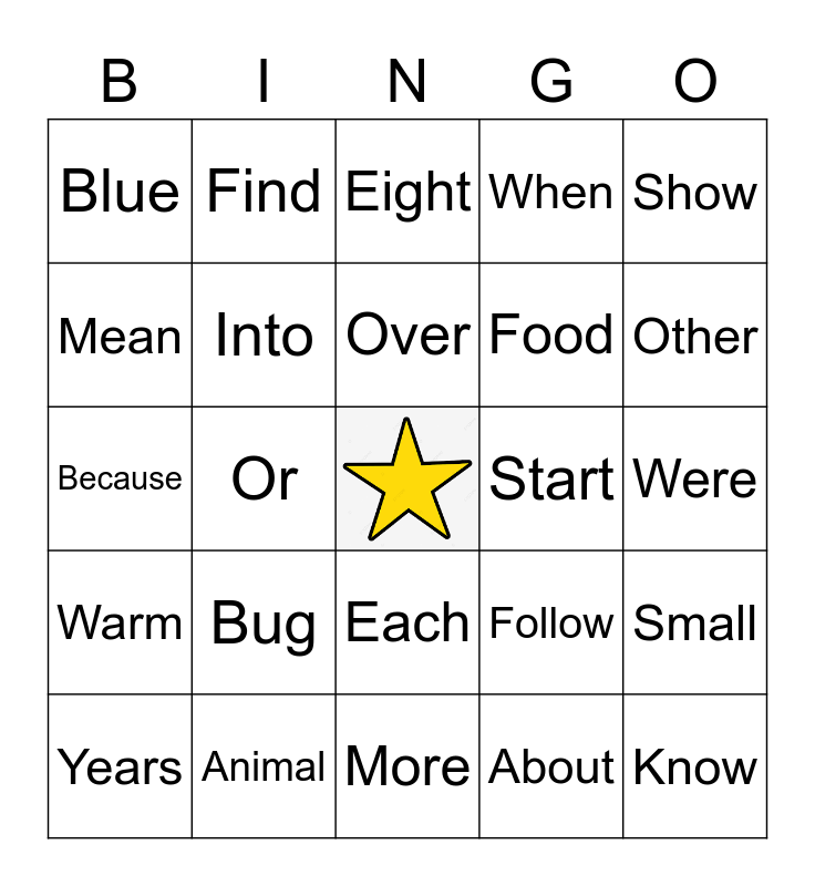 This bingo card has a free space and 24 words: Years, Bug, Over, About, Show, Blue, Find, Eight, Start, Were, Because, Into, Follow, Small, Mean, Animal, More, When, Other, Warm, Or, Each, Food and Know.