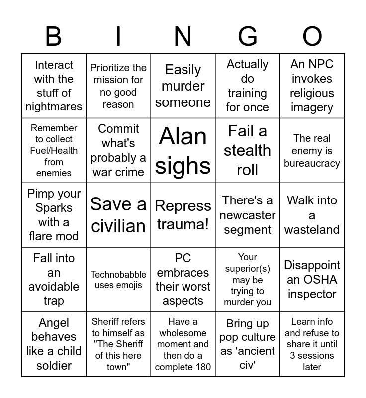 This bingo card has a free space and 24 words: Technobabble uses emojis, Sheriff refers to himself as "The Sheriff of this here town", Alan sighs, Angel behaves like a child soldier, An NPC invokes religious imagery, Interact with the stuff of nightmares, Remember to collect Fuel/Health from enemies, Prioritize the mission for no good reason, There's a newcaster segment, PC embraces their worst aspects, Fail a stealth roll, Pimp your Sparks with a flare mod, Your superior(s) may be trying to murder you, Disappoint an OSHA inspector, Commit what's probably a war crime, Bring up pop culture as 'ancient civ', Walk into a wasteland, Easily murder someone, The real enemy is bureaucracy, Save a civilian, Learn info and refuse to share it until 3 sessions later, Fall into an avoidable trap, Actually do training for once and Have a wholesome moment and then do a complete 180.