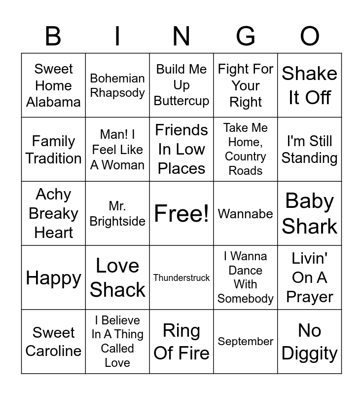 This bingo card has a free space and 29 words: Sweet Caroline, Don't Stop Believin', Mr. Brightside, I Will Survive, Sweet Home Alabama, Build Me Up Buttercup, Man! I Feel Like A Woman, Love Shack, Wannabe, I Believe In A Thing Called Love, Baby Shark, No Diggity, Ring Of Fire, September, I'm Still Standing, Stayin' Alive, Thunderstruck, Happy, Shake It Off, Achy Breaky Heart, I Wanna Dance With Somebody, Hello, Take Me Home, Country Roads, Family Tradition, Fight For Your Right, Bohemian Rhapsody, Livin' On A Prayer, Friends In Low Places and Always Be My Baby.
