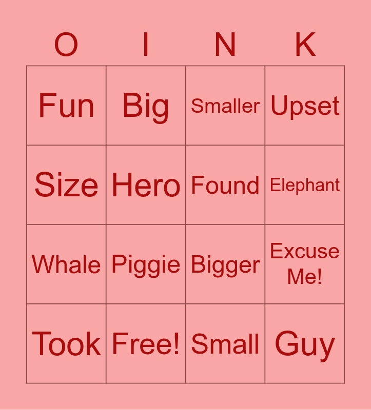 This bingo card has 16 words: Free!, Excuse Me!, Smaller, Fun, Whale, Big, Bigger, Small, Size, Hero, Took, Upset, Piggie, Elephant, Found and Guy.