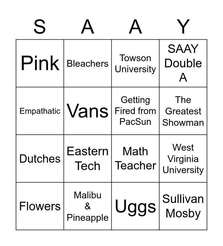 This bingo card has 16 words: Malibu & Pineapple, West Virginia University, Towson University, Pink, Dutches, Bleachers, Math Teacher, Uggs, Empathatic, Vans, Flowers, SAAY Double A, Eastern Tech, The Greatest Showman, Getting Fired from PacSun and Sullivan Mosby.