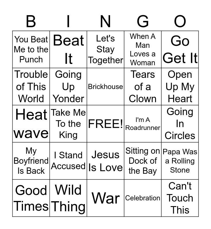 This bingo card has a free space and 24 words: I Stand Accused, Wild Thing, Brickhouse, Good Times, Go Get It, You Beat Me to the Punch, Trouble of This World, Beat It, I'm A Roadrunner, Jesus Is Love, Tears of a Clown, Heat wave, Sitting on Dock of the Bay, Papa Was a Rolling Stone, Going Up Yonder, Celebration, Going In Circles, Let's Stay Together, Open Up My Heart, Take Me To the King, Can't Touch This, My Boyfriend Is Back, When A Man Loves a Woman and War.