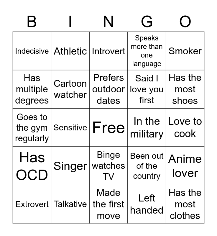 This bingo card has a free space and 24 words: Singer, Talkative, Prefers outdoor dates, Extrovert, Smoker, Indecisive, Has multiple degrees, Athletic, In the military, Binge watches TV, Said I love you first, Goes to the gym regularly, Been out of the country, Anime lover, Cartoon watcher, Left handed, Love to cook, Introvert, Has the most shoes, Sensitive, Has the most clothes, Has OCD, Speaks more than one language and Made the first move.
