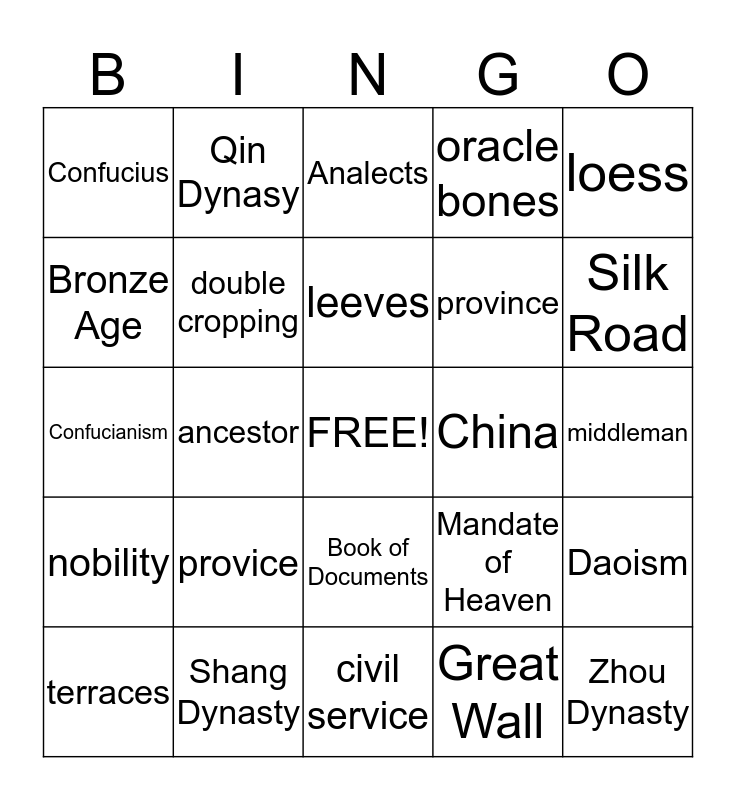This bingo card has a free space and 24 words: provice, Shang Dynasty, leeves, terraces, loess, Confucius, Bronze Age, Qin Dynasy, China, Book of Documents, province, Confucianism, Mandate of Heaven, Daoism, double cropping, Great Wall, middleman, Analects, Silk Road, ancestor, Zhou Dynasty, nobility, oracle bones and civil service.