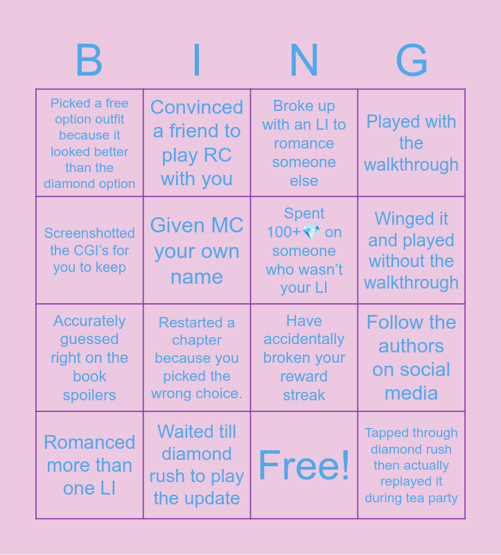 This bingo card has 17 words: Free!, Romanced more than one LI, Broke up with an LI to romance someone else, Picked a free option outfit because it looked better than the diamond option, Restarted a chapter because you picked the wrong choice., Played with the walkthrough, Follow the authors on social media, Spent 100+💎 on someone who wasn’t your LI, Winged it and played without the walkthrough, Given MC your own name, Waited till diamond rush to play the update, Have accidentally broken your reward streak, Screenshotted the CGI’s for you to keep, Convinced a friend to play RC with you, Accurately guessed right on the book spoilers, Followed more than 10 fan accounts and Tapped through diamond rush then actually replayed it during tea party.