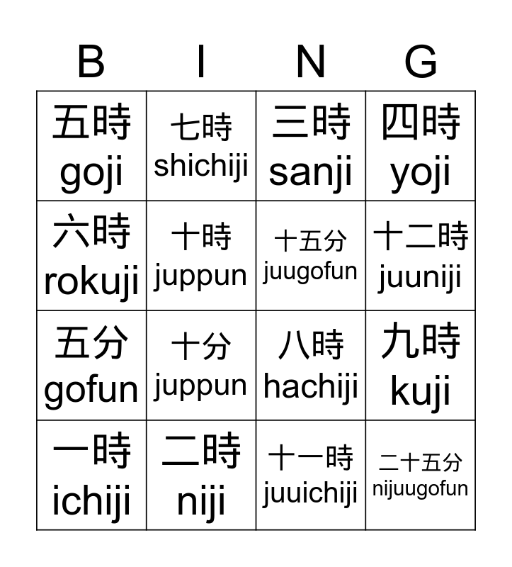 This bingo card has 16 words: 一時 ichiji, 二時 niji, 三時 sanji, 四時yoji, 六時 rokuji, 七時 shichiji, 八時hachiji, 九時kuji, 五時goji, 十時juppun, 十一時juuichiji, 十二時 juuniji, 五分 gofun, 十分 juppun, 十五分juugofun and 二十五分nijuugofun.
