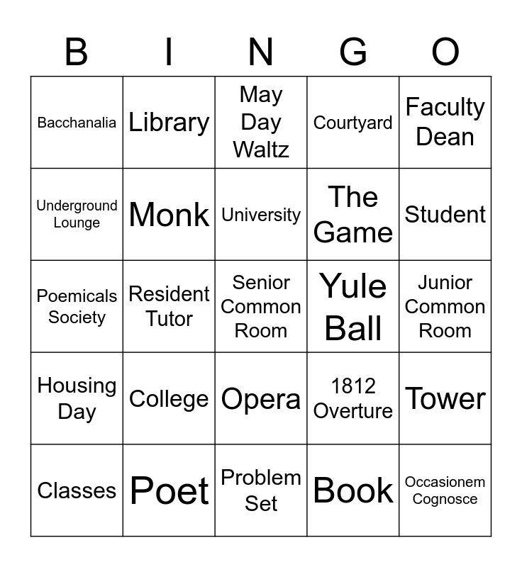 This bingo card has 37 words: Free!, Bells, Russia, Monk, Tower, College, University, Lowell House, Faculty Dean, Resident Dean, Resident Tutor, Courtyard, Senior Common Room, Junior Common Room, Underground Lounge, Housing Day, Harvard Yale, May Day Waltz, Opera, Yule Ball, Bacchanalia, Student, Classes, Problem Set, Research Paper, Book, Library, Matt Damon, Natalie Portman, Trivia, Industrial Revolution, Poet, Poemicals Society, Occasionem Cognosce, 1812 Overture, The Game and Coffeehouse.