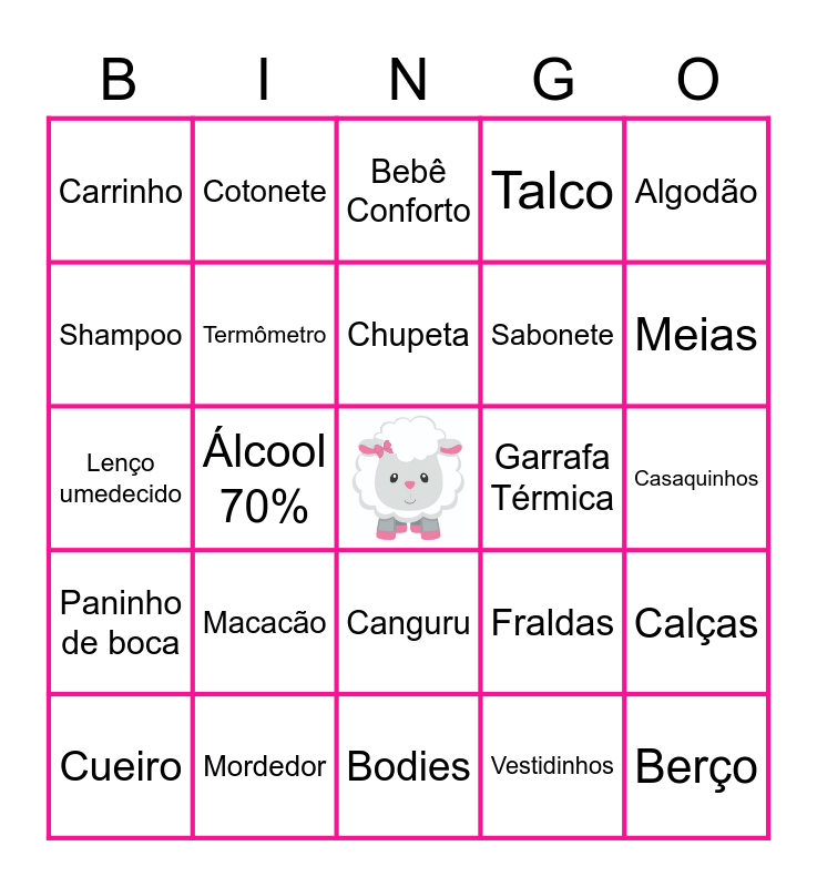 This bingo card has a free space and 30 words: Mordedor, Toalha, Álcool 70%, Banheirinha, Carrinho, Bebê Conforto, Termômetro, Canguru, Garrafa Térmica, Bodies, Casaquinhos, Berço, Vestidinhos, Sapatinhos, Meias, Touca, Fraldas, Paninho de boca, Macacão, Algodão, Lenço umedecido, Pomada, Cotonete, Sabonete, Shampoo, Talco, Calças, Cueiro, Chupeta and Babador.
