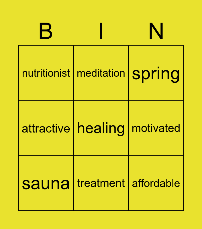 This bingo card has a free space and 8 words: motivated, spring, meditation, sauna, nutritionist, affordable, attractive and treatment.