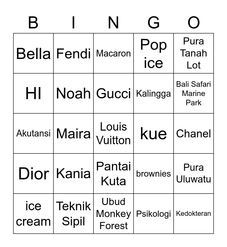 This bingo card has a free space and 24 words: Kania, Teknik Sipil, Gucci, ice cream, Pura Tanah Lot, Bella, HI, Fendi, kue, Pantai Kuta, Kalingga, Akutansi, brownies, Pura Uluwatu, Noah, Psikologi, Chanel, Macaron, Bali Safari Marine Park, Maira, Kedokteran, Dior, Pop ice and Ubud Monkey Forest.