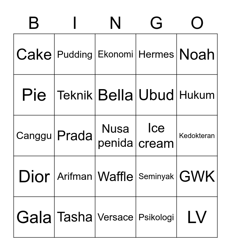 This bingo card has a free space and 24 words: Arifman, Tasha, Bella, Gala, Noah, Cake, Pie, Pudding, Ice cream, Waffle, Ubud, Canggu, Seminyak, GWK, Teknik, Psikologi, Kedokteran, Ekonomi, Hukum, Prada, LV, Dior, Hermes and Versace.