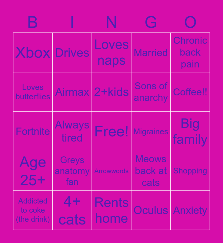 This bingo card has a free space and 24 words: Greys anatomy fan, 4+ cats, 2+kids, Addicted to coke (the drink), Chronic back pain, Xbox, Loves butterflies, Drives, Migraines, Arrowwords, Sons of anarchy, Fortnite, Meows back at cats, Shopping, Airmax, Oculus, Big family, Loves naps, Coffee!!, Always tired, Anxiety, Age 25+, Married and Rents home.
