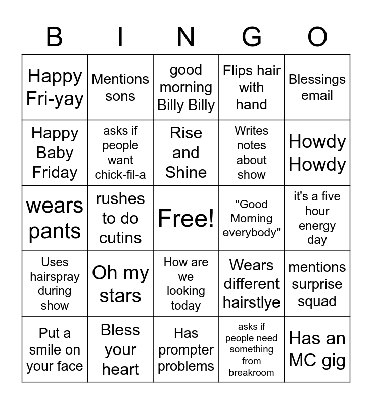 This bingo card has a free space and 24 words: Oh my stars, Bless your heart, Rise and Shine, Put a smile on your face, Blessings email, Happy Fri-yay, Happy Baby Friday, Mentions sons, "Good Morning everybody", How are we looking today, Writes notes about show, wears pants, Wears different hairstlye, mentions surprise squad, asks if people want chick-fil-a, asks if people need something from breakroom, it's a five hour energy day, good morning Billy Billy, Howdy Howdy, rushes to do cutins, Has an MC gig, Uses hairspray during show, Flips hair with hand and Has prompter problems.