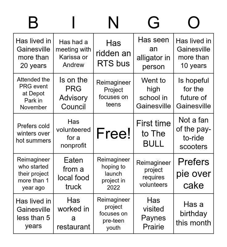 This bingo card has a free space and 25 words: Eaten from a local food truck, Reimagineer project focuses on pre-teen youth, Reimagineer Project focuses on teens, Has lived in Gainesville less than 5 years, Has lived in Gainesville more than 10 years, Has lived in Gainesville more than 20 years, Attended the PRG event at Depot Park in November, Has had a meeting with Karissa or Andrew, First time to The BULL, Reimagineer hoping to launch project in 2022, Went to high school in Gainesville, Prefers cold winters over hot summers, Reimagineer project requires volunteers, Prefers pie over cake, Is on the PRG Advisory Council, Changed jobs during COVID, Not a fan of the pay-to-ride scooters, Has ridden an RTS bus, Is hopeful for the future of Gainesville, Has volunteered for a nonprofit, Has a birthday this month, Has worked in a restaurant, Reimagineer who started their project more than 1 year ago, Has seen an alligator in person and Has visited Paynes Prairie.