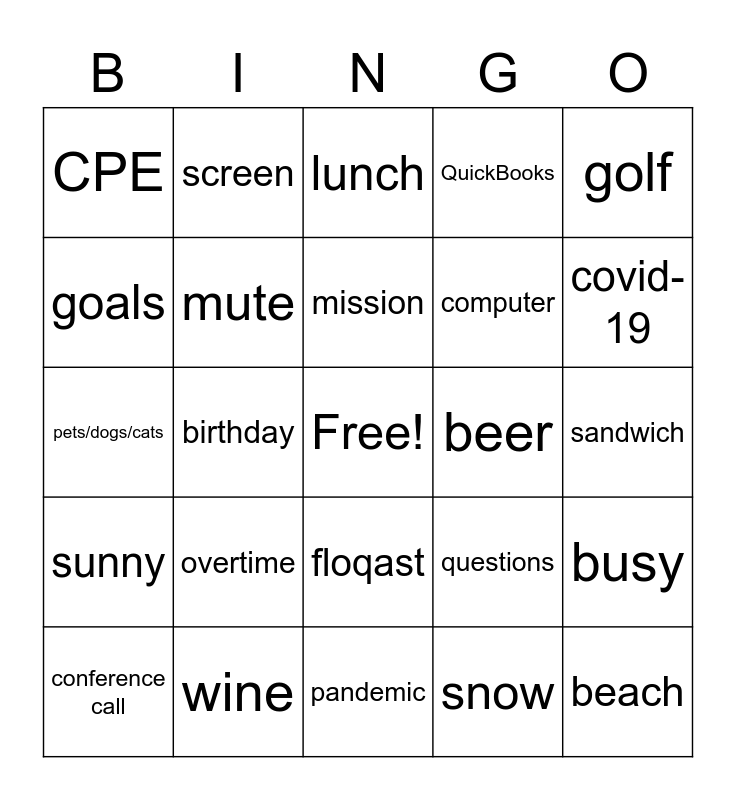 This bingo card has a free space and 43 words: vacation, beach, meeting, conference call, client, snow, lunch, emails, golf, wine, QuickBooks, beer, floqast, overtime, bill.com, pandemic, kids, pets/dogs/cats, hiking, covid-19, screen, reading, concert, CPE, salad, sandwich, Naples, Sarasota, questions, sunny, virtual, busy, month end, birthday, training, voicemail, team, mission, goals, computer, volume, mute and coffee.
