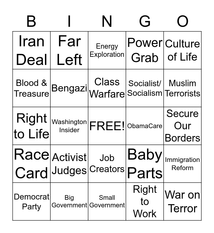 This bingo card has a free space and 24 words: Activist Judges, Big Government, Class Warfare, Democrat Party, Culture of Life, Iran Deal, Blood & Treasure, Far Left, ObamaCare, Job Creators, Socialist/ Socialism, Right to Life, Baby Parts, Immigration Reform, Bengazi, Right to Work, Secure Our Borders, Energy Exploration, Muslim Terrorists, Washington Insider, War on Terror, Race Card, Power Grab and Small Government.
