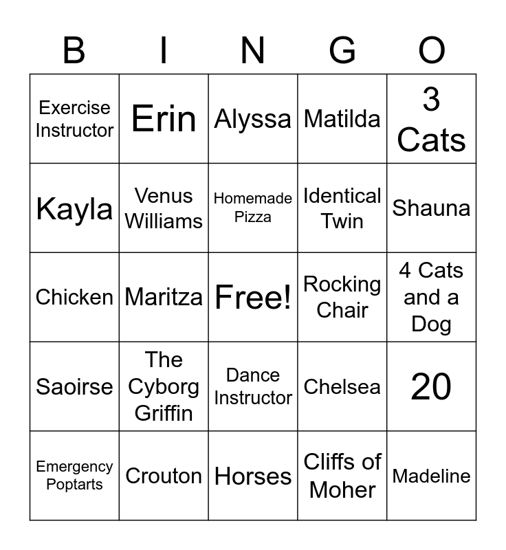 This bingo card has a free space and 24 words: The Cyborg Griffin, Crouton, Homemade Pizza, Emergency Poptarts, 3 Cats, Exercise Instructor, Kayla, Erin, Rocking Chair, Dance Instructor, Identical Twin, Chicken, Chelsea, 20, Venus Williams, Cliffs of Moher, 4 Cats and a Dog, Alyssa, Shauna, Maritza, Madeline, Saoirse, Matilda and Horses.