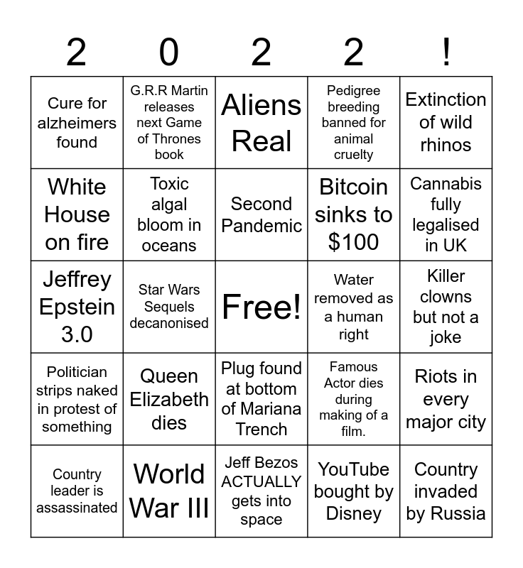 This bingo card has a free space and 24 words: Queen Elizabeth dies, World War III, Second Pandemic, Country leader is assassinated, Extinction of wild rhinos, Cure for alzheimers found, White House on fire, G.R.R Martin releases next Game of Thrones book, Water removed as a human right, Plug found at bottom of Mariana Trench, Bitcoin sinks to $100, Jeffrey Epstein 3.0, Famous Actor dies during making of a film., Riots in every major city, Toxic algal bloom in oceans, YouTube bought by Disney, Killer clowns but not a joke, Aliens Real, Cannabis fully legalised in UK, Star Wars Sequels decanonised, Country invaded by Russia, Politician strips naked in protest of something, Pedigree breeding banned for animal cruelty and Jeff Bezos ACTUALLY gets into space.