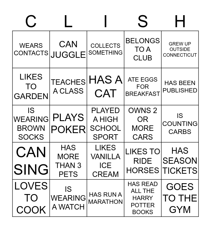 This bingo card has a free space and 24 words: HAS MORE THAN 3 PETS, IS WEARING A WATCH, HAS A CAT, LOVES TO COOK, GREW UP OUTSIDE CONNECTICUT, WEARS CONTACTS, LIKES TO GARDEN, CAN JUGGLE, OWNS 2 OR MORE CARS, LIKES VANILLA ICE CREAM, ATE EGGS FOR BREAKFAST, IS WEARING BROWN SOCKS, LIKES TO RIDE HORSES, HAS SEASON TICKETS, TEACHES A CLASS, HAS READ ALL THE HARRY POTTER BOOKS, IS COUNTING CARBS, COLLECTS SOMETHING, HAS BEEN PUBLISHED, PLAYS POKER, GOES TO THE GYM, CAN SING, BELONGS TO A CLUB and HAS RUN A MARATHON.