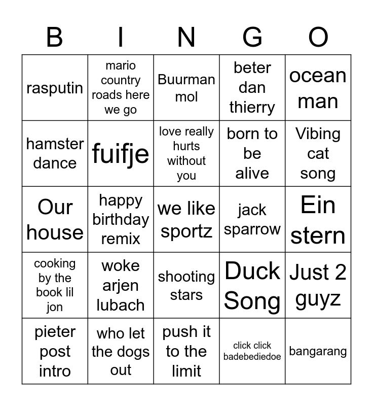 This bingo card has 25 words: woke arjen lubach, push it to the limit, love really hurts without you, pieter post intro, ocean man, rasputin, hamster dance, mario country roads here we go, jack sparrow, shooting stars, born to be alive, Our house, Duck Song, Just 2 guyz, fuifje, bangarang, Ein stern, Buurman mol, Vibing cat song, happy birthday remix, we like sportz, who let the dogs out, cooking by the book lil jon, beter dan thierry and click click badebediedoe.