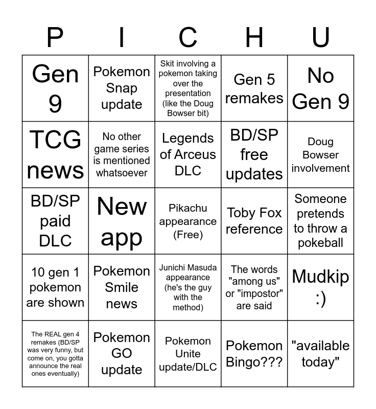This bingo card has a free space and 24 words: Pokemon Smile news, Pokemon GO update, Legends of Arceus DLC, The REAL gen 4 remakes (BD/SP was very funny, but come on, you gotta announce the real ones eventually), No Gen 9, Gen 9, TCG news, Pokemon Snap update, Toby Fox reference, Junichi Masuda appearance (he's the guy with the method), BD/SP free updates, BD/SP paid DLC, The words "among us" or "impostor" are said, Mudkip :), No other game series is mentioned whatsoever, Pokemon Bingo???, Someone pretends to throw a pokeball, Skit involving a pokemon taking over the presentation (like the Doug Bowser bit), Doug Bowser involvement, New app, "available today", 10 gen 1 pokemon are shown, Gen 5 remakes and Pokemon Unite update/DLC.