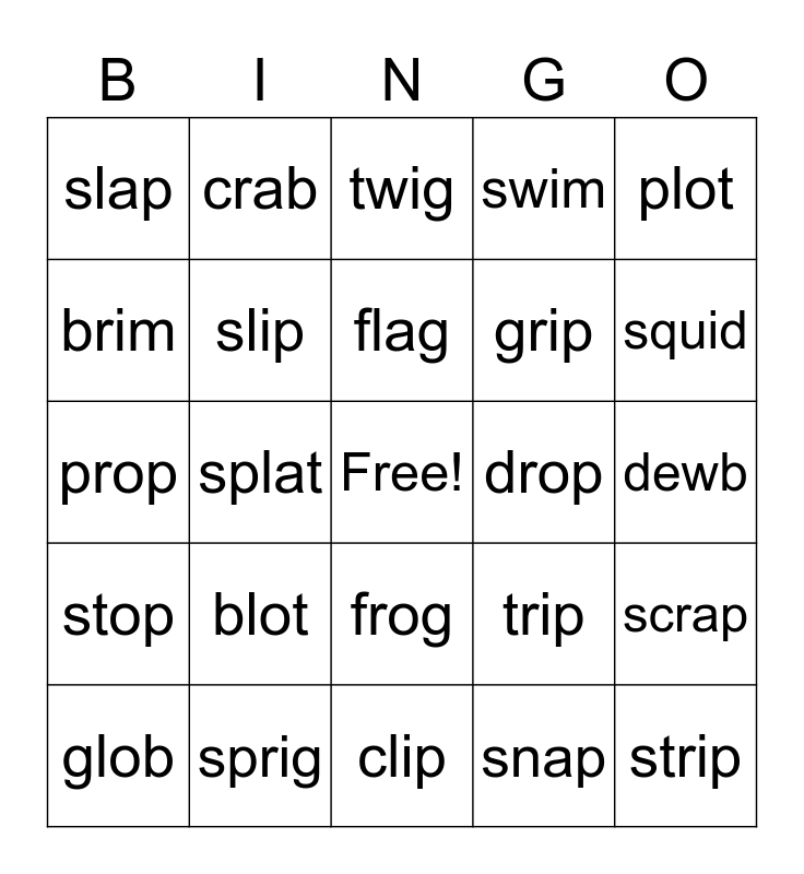 This bingo card has a free space and 25 words: blot, clip, flag, glob, plot, slap, brim, crab, drop, frog, grip, prop, trip, scrap, slip, smog, dewb, twig, squid, splat, strip, sprig, stop, swim and snap.