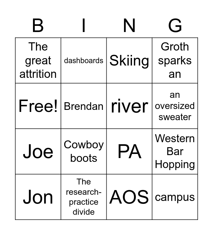This bingo card has 16 words: The research-practice divide, Western Bar Hopping, Skiing, The great attrition, Joe, dashboards, PA, AOS, Free!, Brendan, Jon, Groth sparks an, Cowboy boots, an oversized sweater, river and campus.