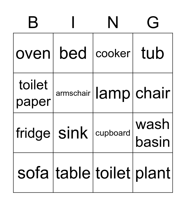 This bingo card has 16 words: table, wash basin, cooker, oven, fridge, bed, cupboard, toilet, toilet paper, armschair, sofa, tub, sink, chair, lamp and plant.