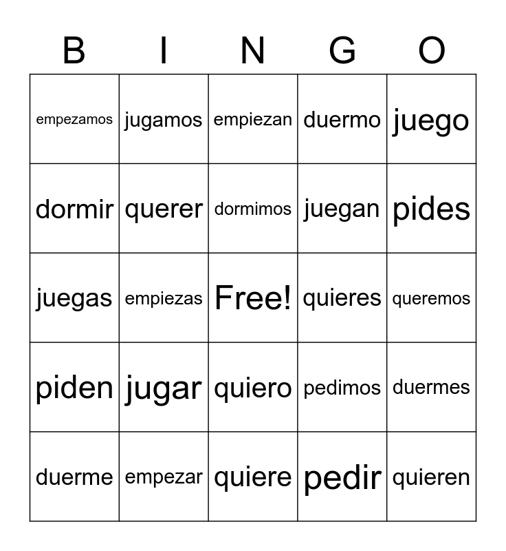 This bingo card has a free space and 30 words: empezar, empiezo, empiezas, empieza, empezamos, empiezan, querer, quiero, quieres, quiere, queremos, quieren, pedir, pido, pides, pide, pedimos, piden, jugar, juego, juegas, juega, jugamos, juegan, dormir, duermo, duermes, duerme, dormimos and duermen.