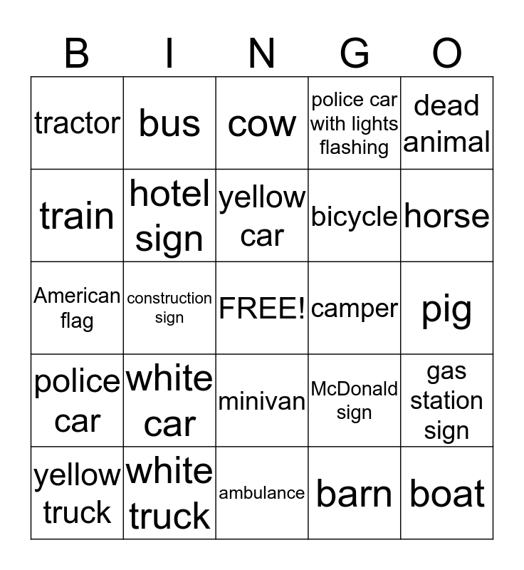 This bingo card has a free space and 24 words: white car, white truck, yellow car, yellow truck, dead animal, tractor, train, bus, camper, minivan, bicycle, American flag, McDonald sign, gas station sign, hotel sign, barn, pig, cow, horse, construction sign, boat, police car, police car with lights flashing and ambulance.