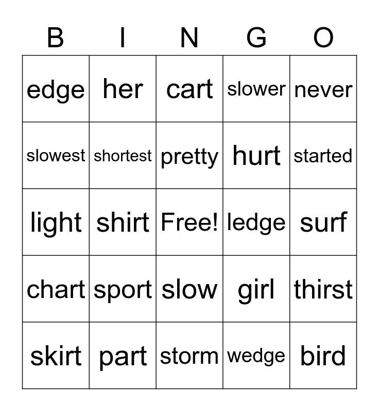 This bingo card has a free space and 35 words: faster, fastest, shorter, shortest, slow, slower, slowest, away, pretty, away, light, never, our, pretty, edge, ledge, wedge, shirt, chart, bird, girl, skirt, thirst, part, cart, started, harm, charm, hurt, surf, burst, storm, sport, her and fern.