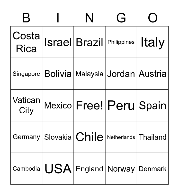 This bingo card has a free space and 30 words: USA, Canada, Mexico, Jamaica, Costa Rica, Brazil, Bolivia, Chile, Peru, England, Spain, Denmark, Norway, Sweden, Austria, Czech Republic, Netherlands, Germany, Slovakia, Italy, Vatican City, Greece, Israel, Jordan, Singapore, Philippines, Thailand, Cambodia, Malaysia and India.