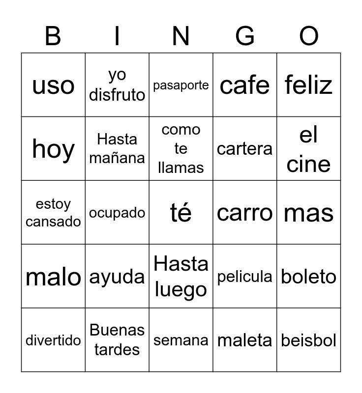 This bingo card has 40 words: como estas, estoy cansado, estoy bien, Hasta mañana, Buenas tardes, Hasta luego, como te llamas, se llama, feliz, malo, ocupado, cafe, té, mas, carro, ayuda, dinero, uso, boligrafo, pasaporte, boleto, maleta, cartera, hoy, mañana, partido, futbol, cuando, beisbol, fiesta, concierto, divertido, el baile, pelicula, el cine, semana, el fin de semana, él/ella disfruta, yo disfruto and tú disfrutas.
