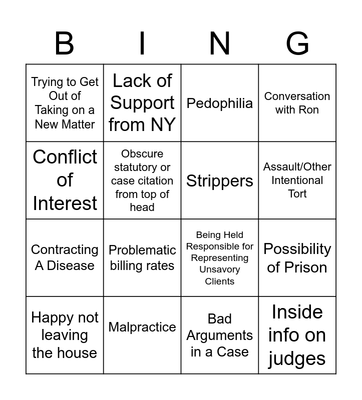 This bingo card has 16 words: Malpractice, Possibility of Prison, Pedophilia, Trying to Get Out of Taking on a New Matter, Contracting A Disease, Lack of Support from NY, Being Held Responsible for Representing Unsavory Clients, Bad Arguments in a Case, Conflict of Interest, Obscure statutory or case citation from top of head, Happy not leaving the house, Conversation with Ron, Problematic billing rates, Assault/Other Intentional Tort, Strippers and Inside info on judges.