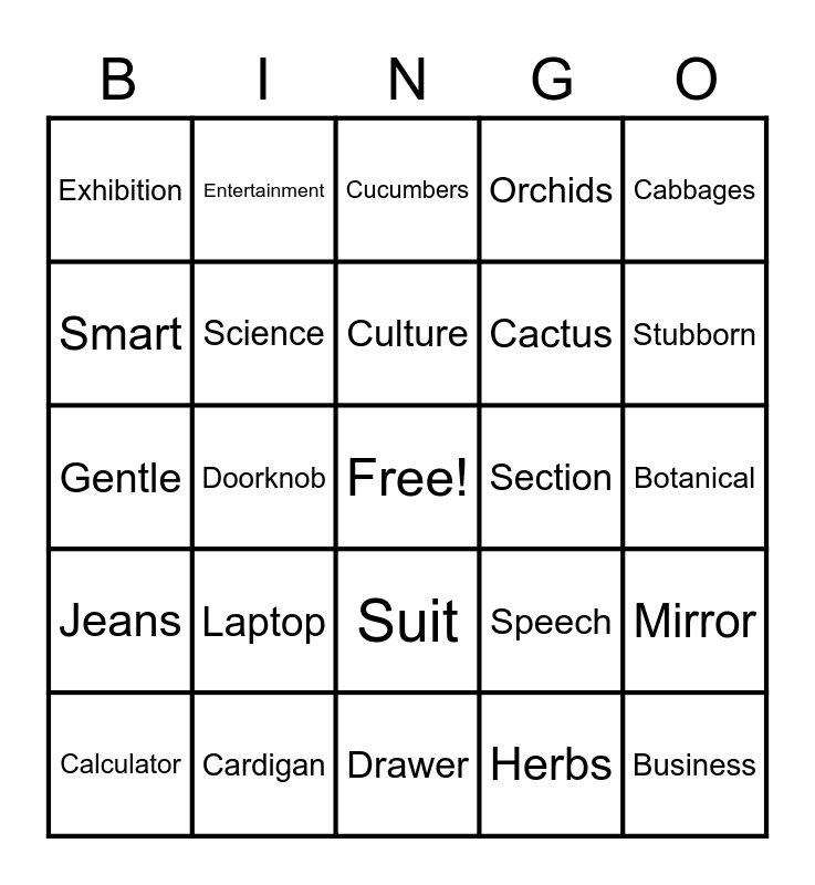 This bingo card has a free space and 24 words: Laptop, Cardigan, Culture, Calculator, Cabbages, Exhibition, Smart, Entertainment, Section, Suit, Cactus, Gentle, Speech, Mirror, Science, Herbs, Botanical, Cucumbers, Stubborn, Doorknob, Business, Jeans, Orchids and Drawer.