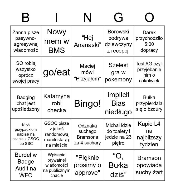 This bingo card has a free space and 57 words: Leśniak mówi "Na spokojnie”, Burdel w Badge Audit na WFC, Podwójne espresso z potrójnym espresso, Żanna pisze pasywno-agresywną wiadomość, "Pięknie prosimy o approve", Katarzyna robi checka, go/eat, Schabowy z Janexa, Szelest gra w pokemony, Kornaga się spóźni, Borowski podrywa dziewczyny z recepcji, Wyjebało istar, Active dzwoni z 2137 nie odbitymi punktami, Bartek mówi jak iwona, SSC kręci badgami, SSS dzwoni z Dropem, Darek przychodziło 5:00 dopracy, Katarzyna robi checka, DeTournelle zwala swoją robotę na innych, Bramson opowiada suchy żart, Implicit Bias niedługo, Sołoduszkiewicz przychodzi na obiad /zgubił dokumenty, Michał idzie do toalety i jedzie na 23 piętro, “Hej Ananaski”, Super Task z dupy, Maciej mówi “Przyjąłem”, SSC się opierdala aż miło, Wyjebało Exit Guarda, Test AG czyli przyjebanie nim o cokolwiek, “Badge mi nie działa”, Wczorajsze jedzenie na obiedzie, Facility robi problemy z dupy, Znowu nie ma badga dla Ever Cleaning, Pół kuchni zapierdala na visitorze, Bułka przypierdala się o bzdury, SO robią wszystko oprócz swojej pracy, Komentarz “proszę o wypełnienie/uzupełnienie”, Badging chat jest upośledzony, SO poszedł w spanko, Ktoś przypadkiem napisał na czacie z GSOC lub SSC, Nowy mem w BMS, Odznaka suchego Bramsona za 4 suchary, Tytoń w szufladzie, Dawn Raid to pinganie sundara, “Trzeba sobie jakoś radzić”, Piesek na KONJ, GSOC pisze z jakąś randomową manifestacją na mieście, Wpisanie prywatnej wiadomości na publicznym chacie, Darek dzwoni o 23 pomimo braku zmiany, Dostanie zjeby od SS, Karta pułapka- Wypowiedzonko, “O, Bułka dziś”, Kanapka “sushi januszi”, Do dropa na WFC dodajemy obiad., Odsprzedam dropa, Kupie L4 na najblizszy tydzien and “Ale dzisiaj spokojnie”.