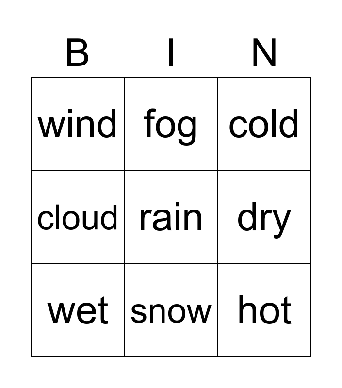 This bingo card has 9 words: wet, cold, fog, cloud, wind, dry, rain, hot and snow.